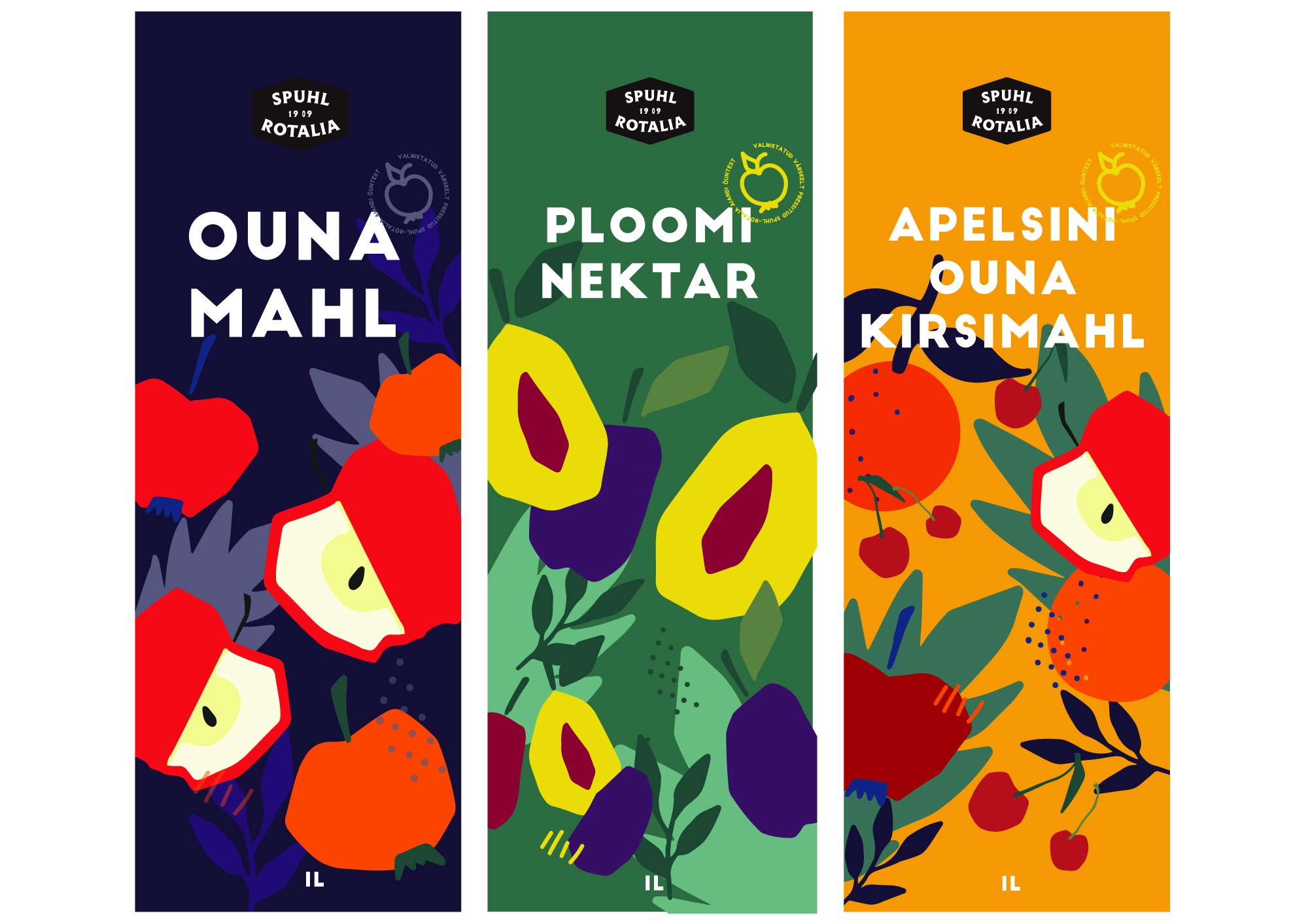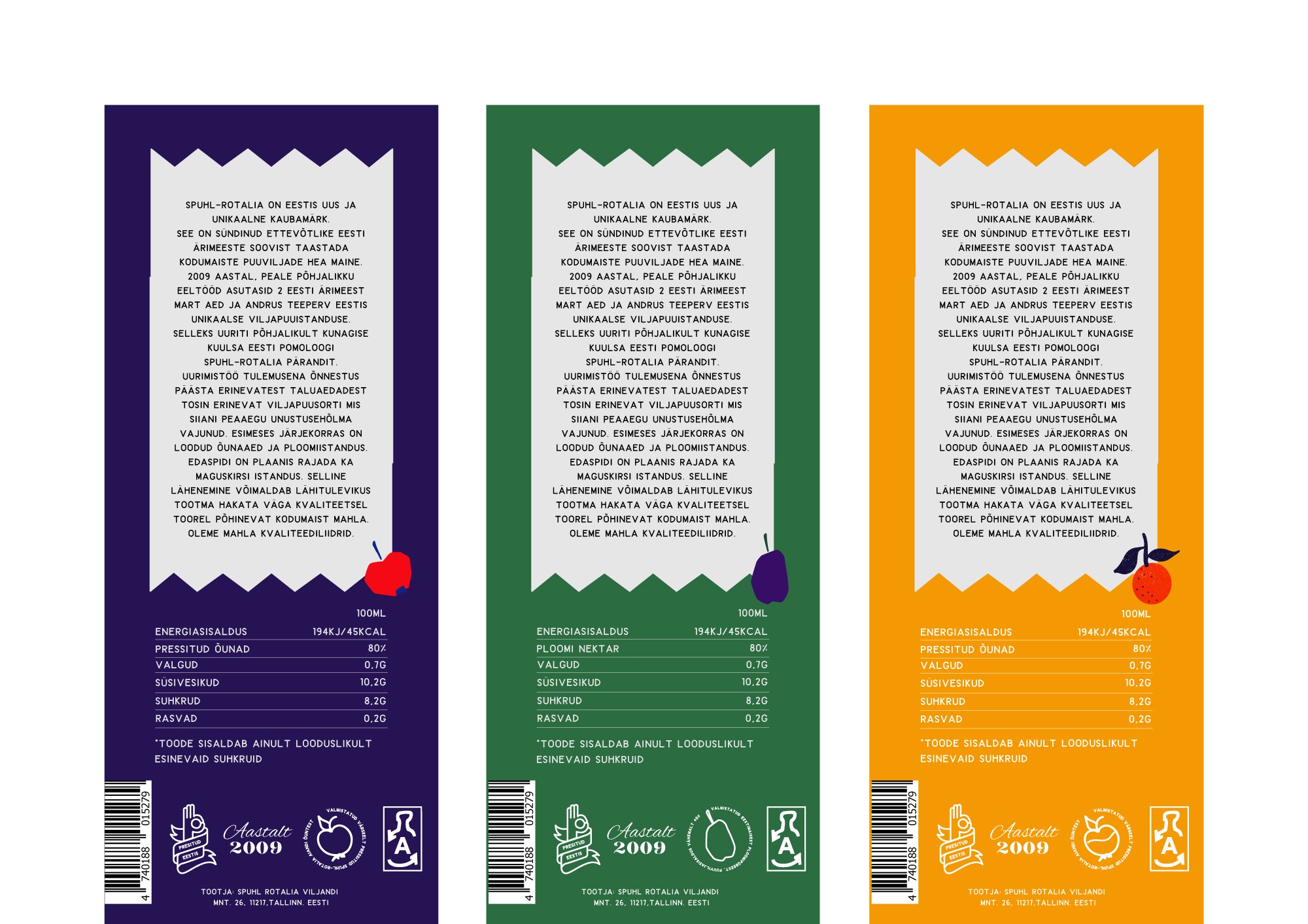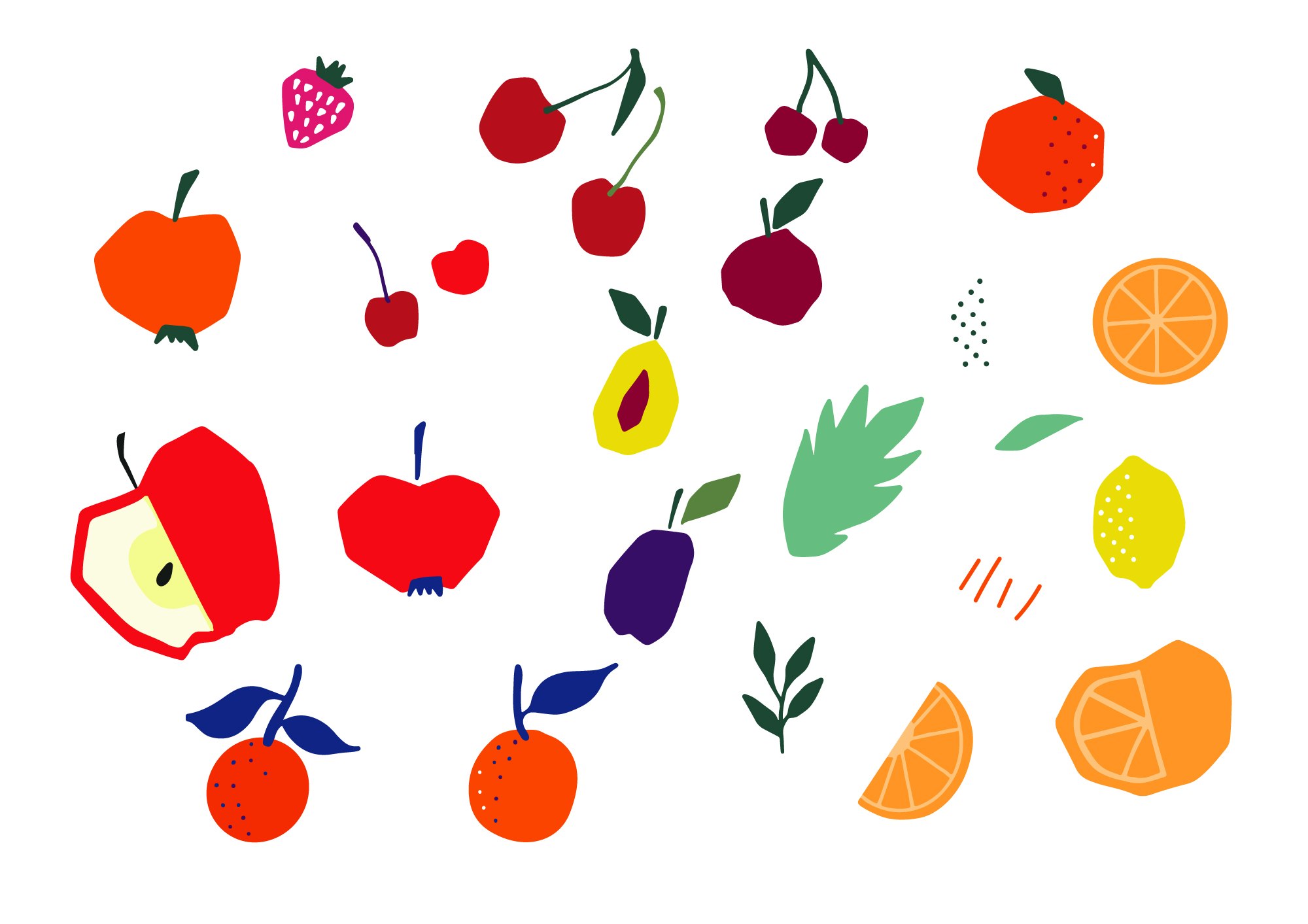 Käsitsi Procreate programmis joonistatud viljad ning töödelnud Adobe Ilustraatoris. Värvid ja elemendid valitud, et disain oleks ainulaadne ja viljad oleksid värsketes toonides. Kasutatud illustratsioonid tegin ise Procreates.
