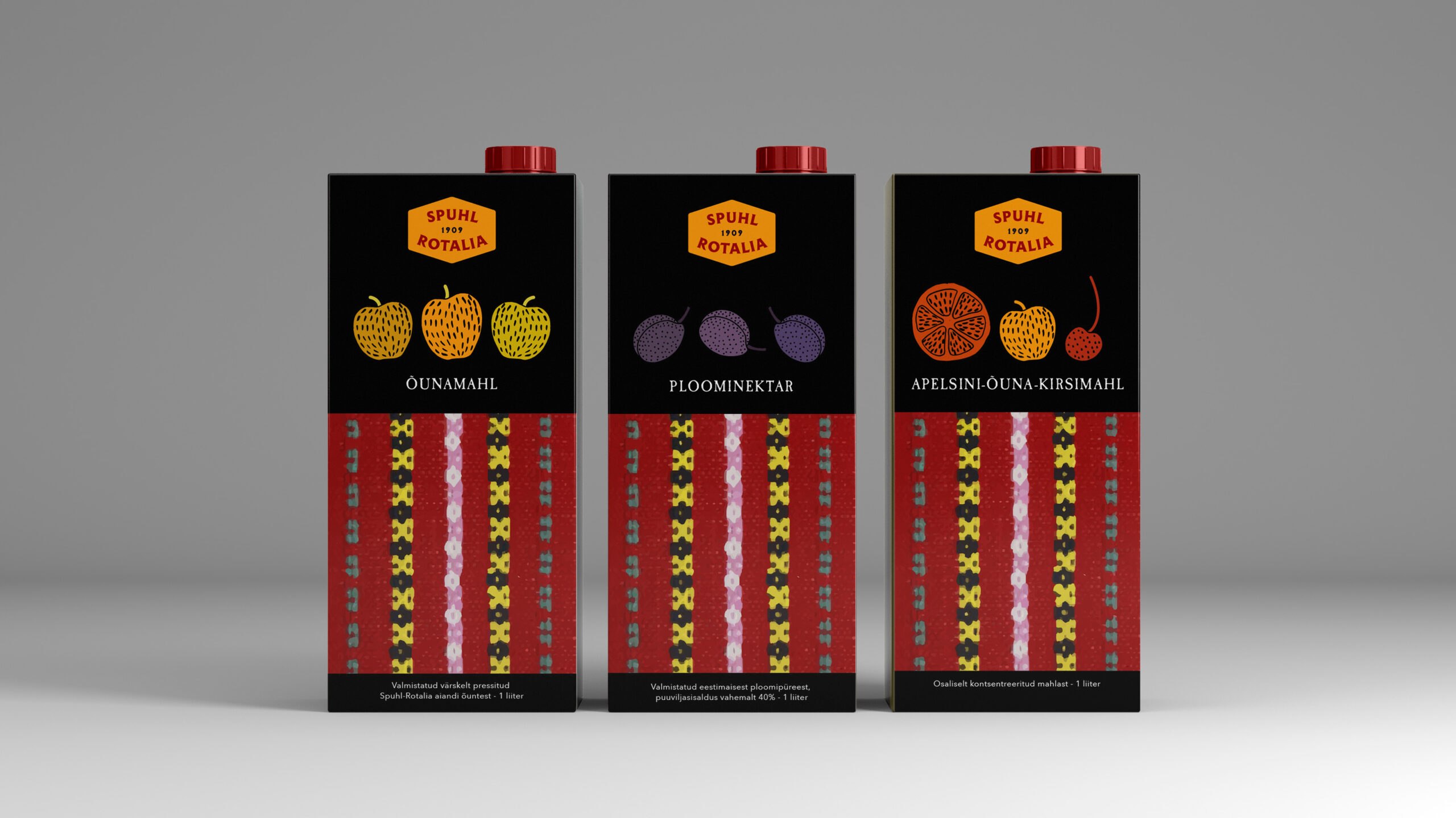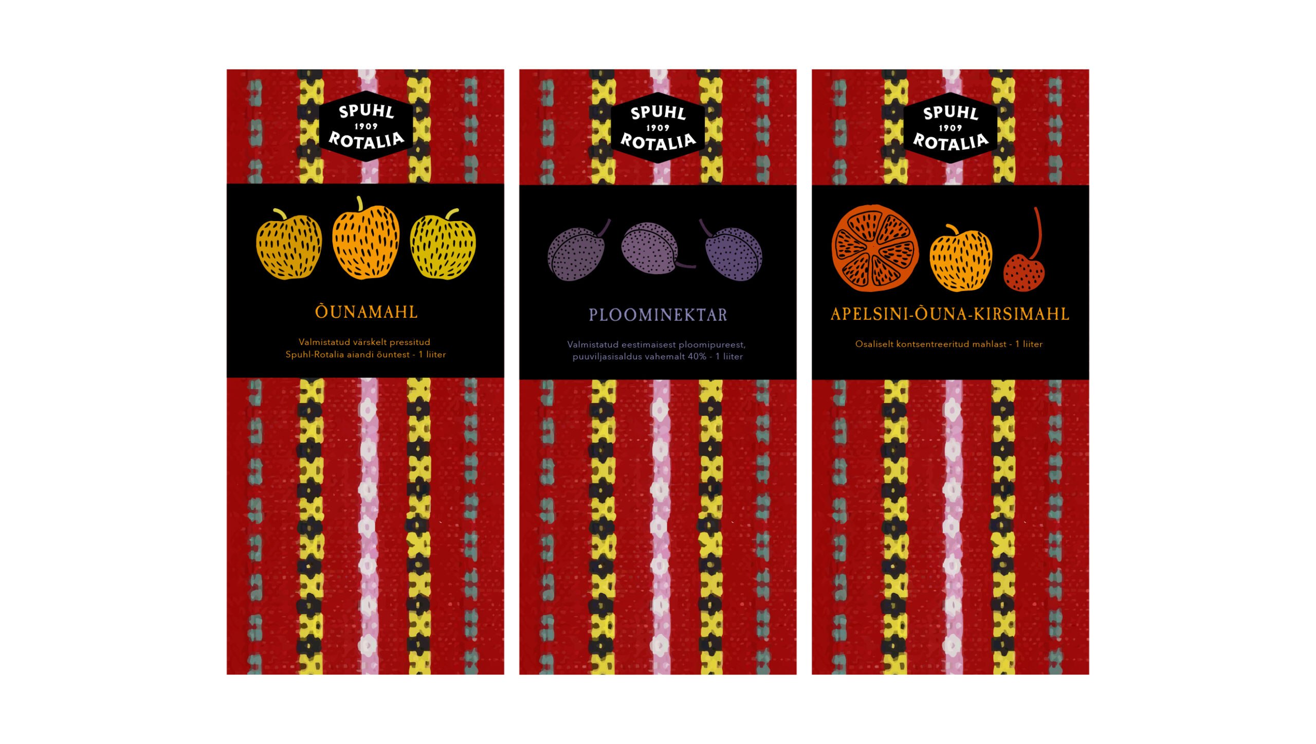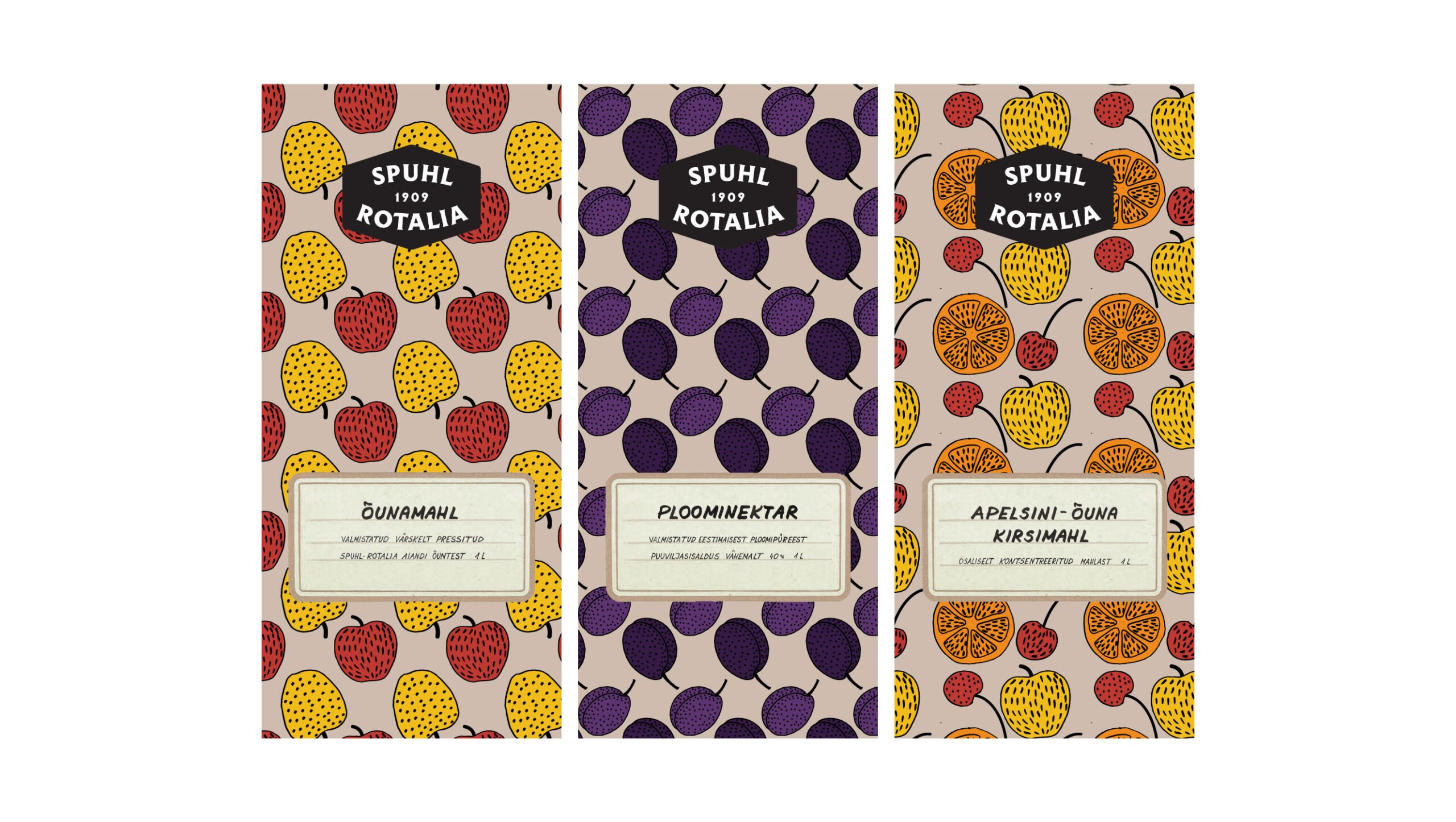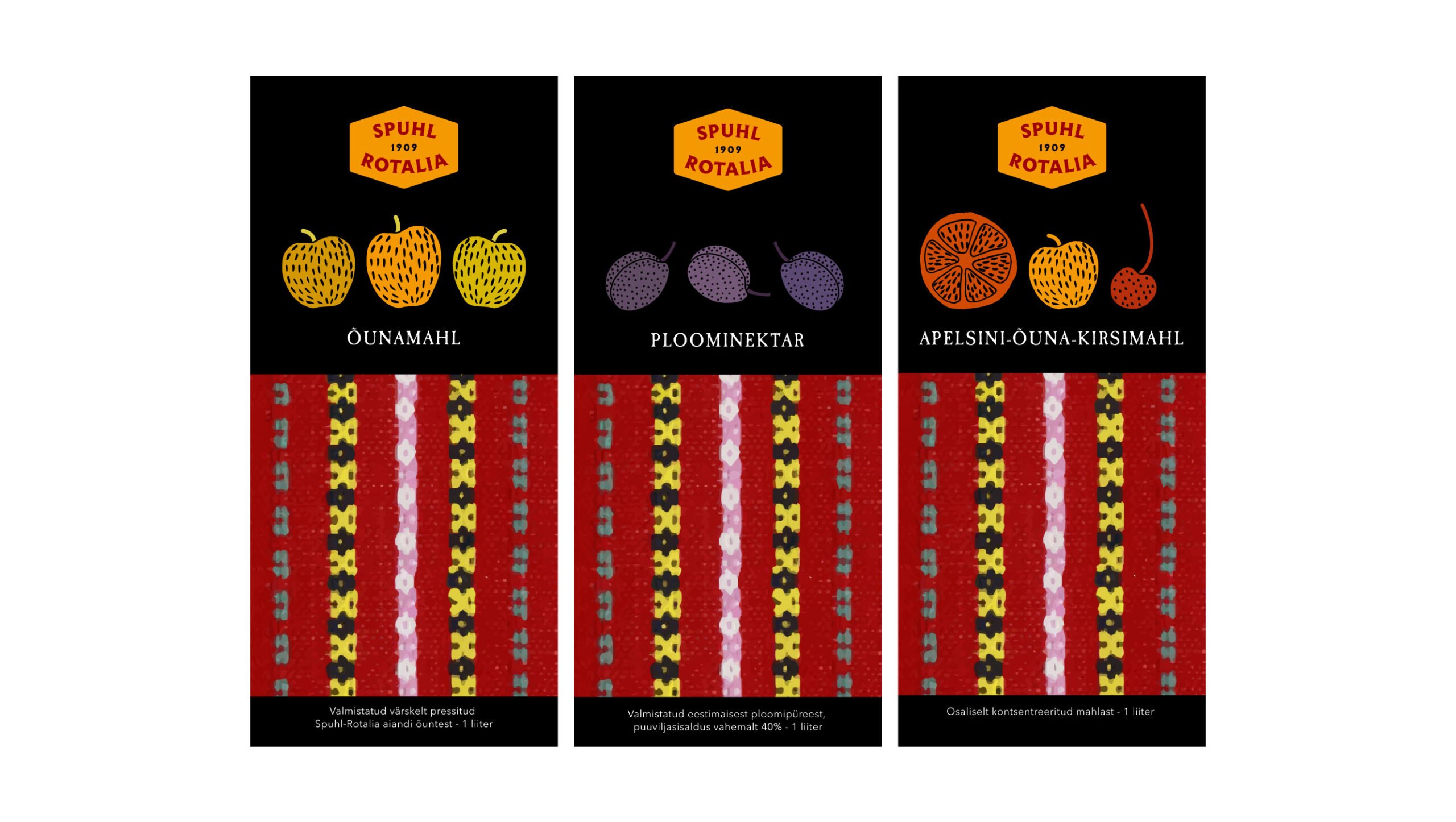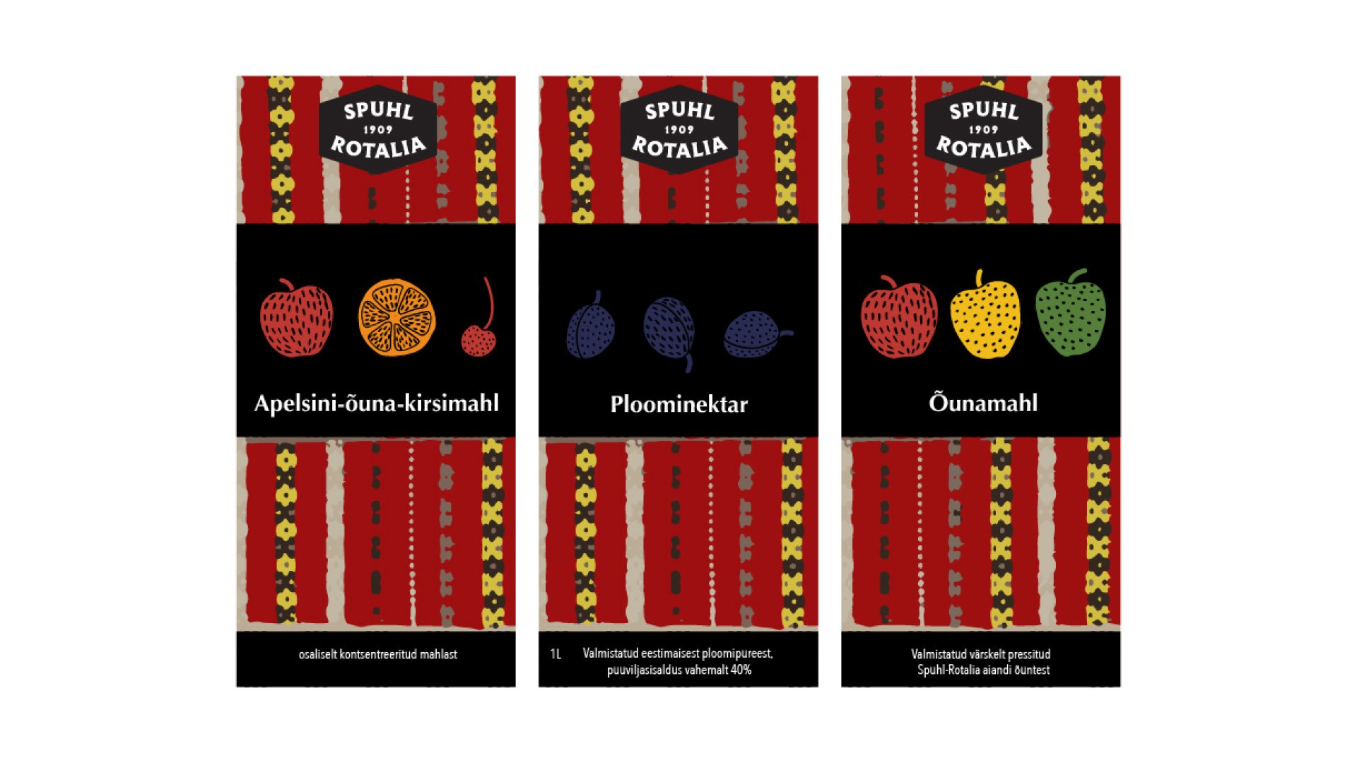 Kujunduse põhielemendina on kasutatud vektoriseeritud Vormsi vaiba mustrit, mis iseloomustab Spuhl-Rotalia õunte päritolu.