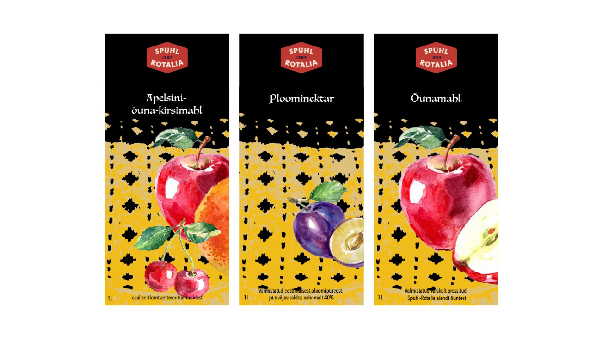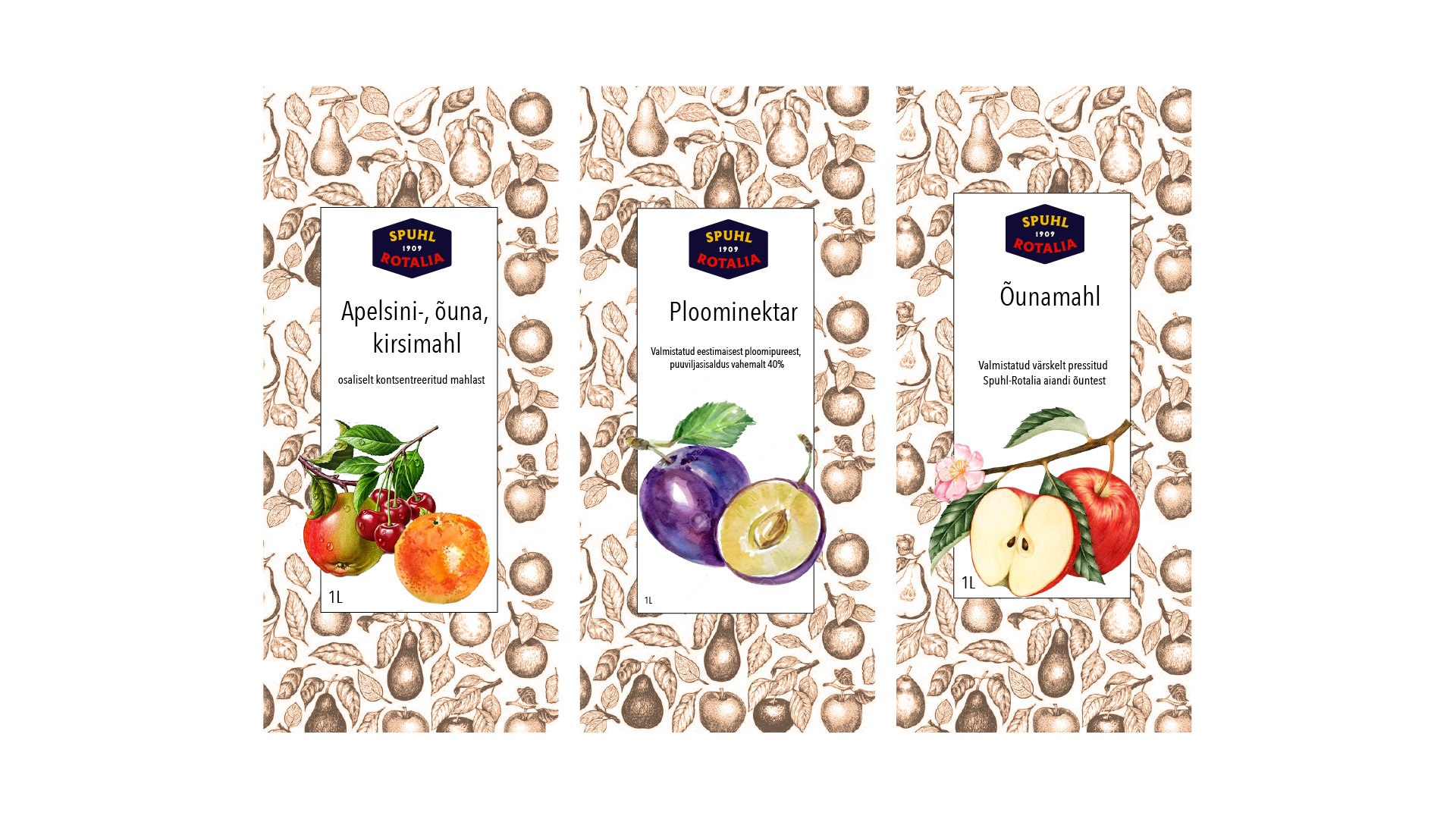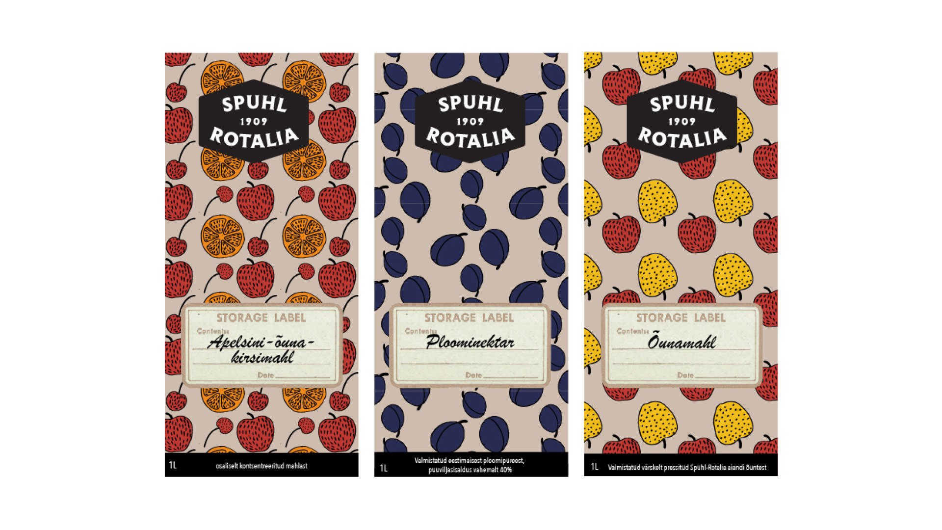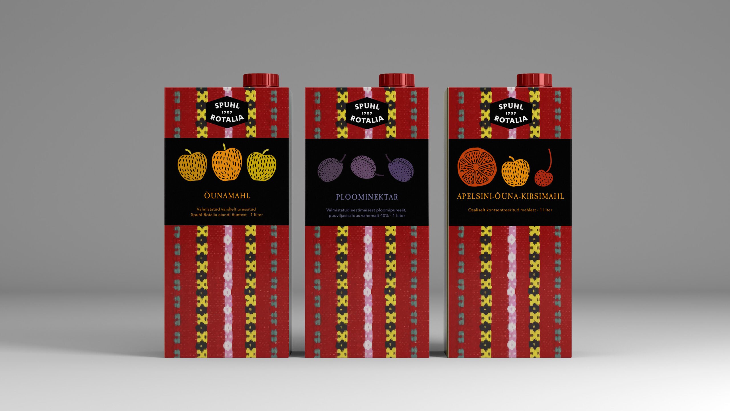 Kujunduse põhielemendina on kasutatud vektoriseeritud Vormsi vaiba mustrit, mis iseloomustab Spuhl-Rotalia õunte päritolu.